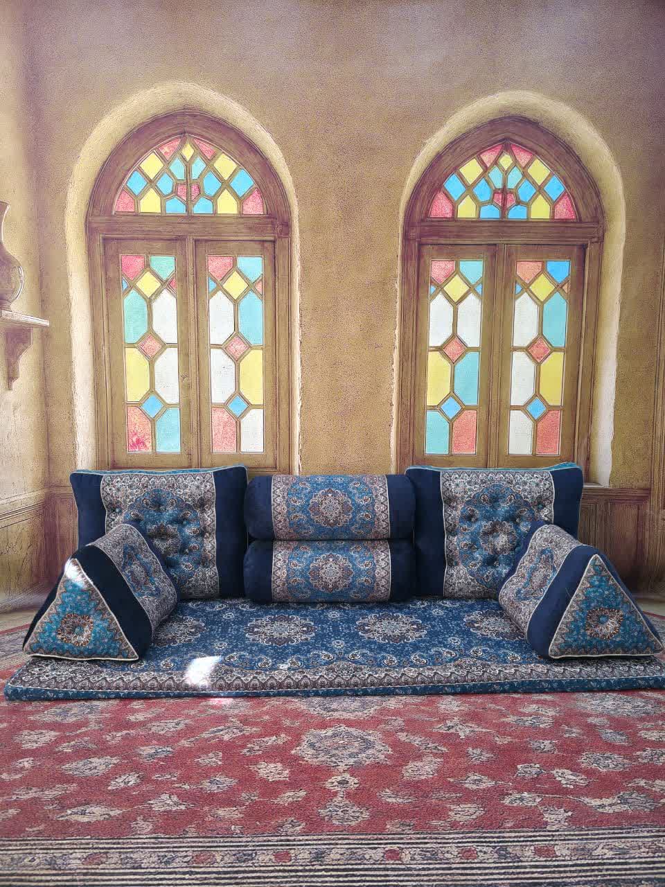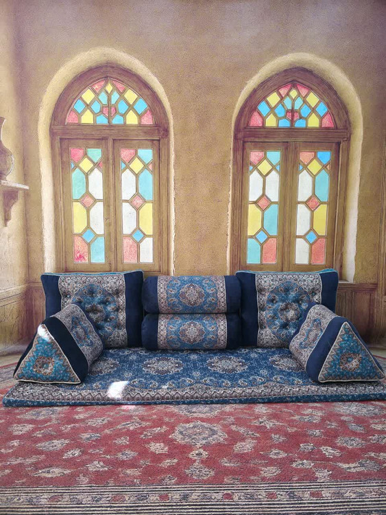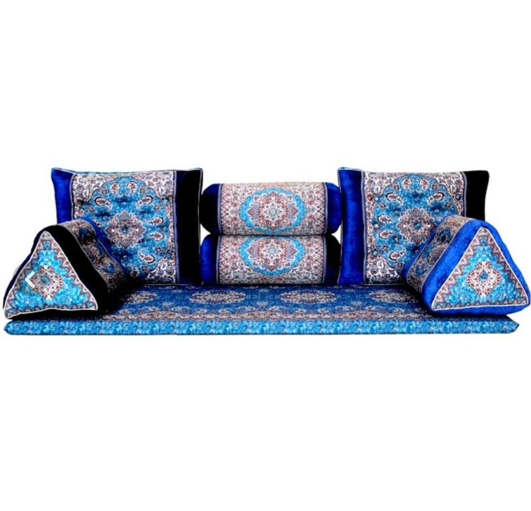 پشتی سنتی شاه نشین رنگ آبی جنس آن ترمه تراکم 150 و 5 رنگ ترمه یکی از طرح های پرفروش است که این سرویس ترمه را با ضمانت 48 ماهه و قیمت مناسب میتوانید سفارش دهید. داخل تشک هر سرویس شاهنشین معمولا از فوم 5 سانتیمتری استفاده میشود.