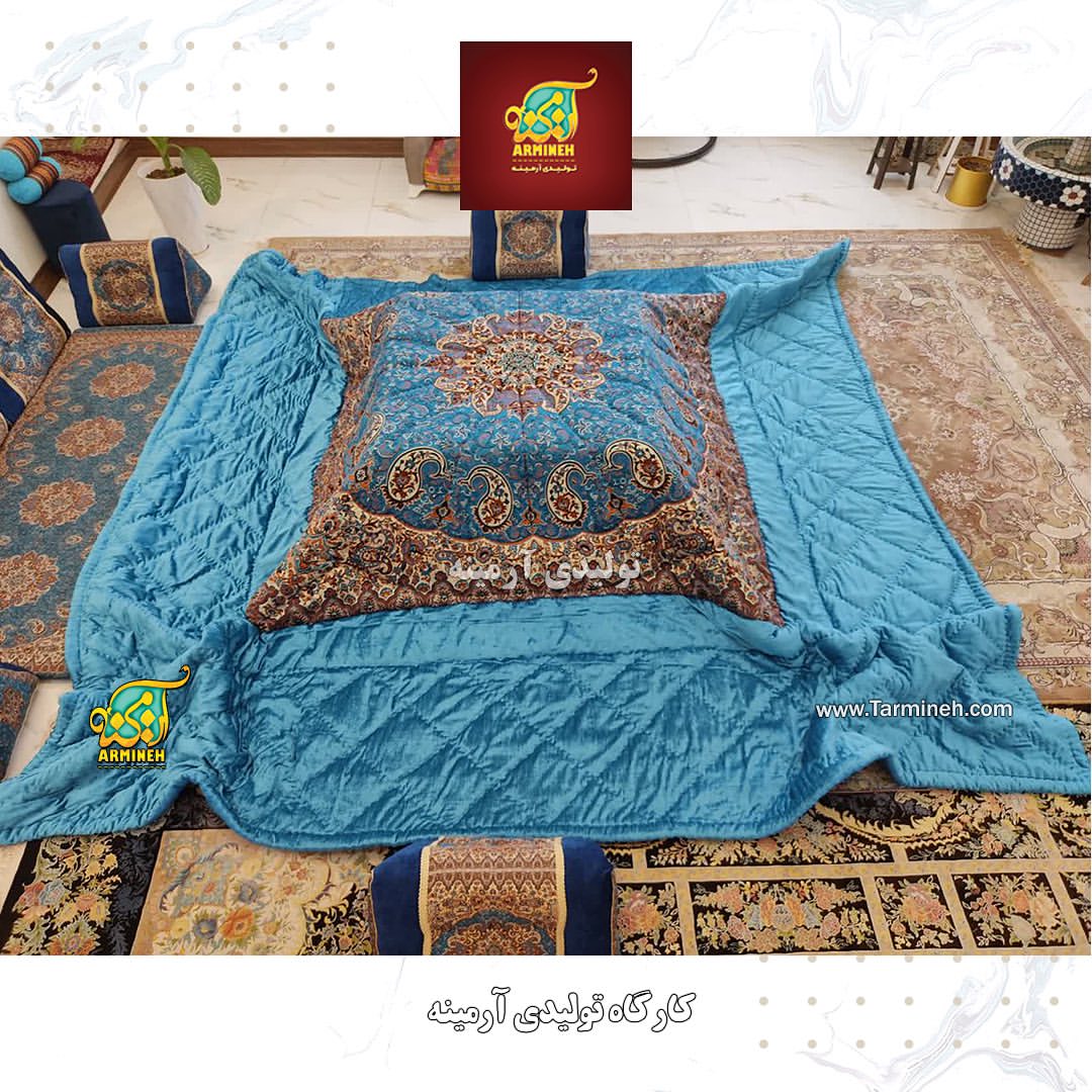 لحاف کرسی دست دوز ترمه طرح نسترن رنگ آبی از الیاف لایکو پر شده و حاشیه دور آن مخمل شانل دوخت شده است. به طور کلی لحاف کرسی ها از الیاف لایکو پرشده و در صورتی که شما بخواهید از پشم حیوانی یا پنبه طبیعی داخل لحاف پر بشه، باید به ما اطلاع بدید.